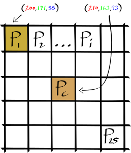 For every pixel \(P_c\) of the image \(I\), we execute some code, a CUDA kernel, that will transform it: \(I^{filtered}(P_c)\). The kernel \(\Omega\) is centered over \(P_c\) and is parameterized as an \(x\) by \(y\) window of pixel neighbors. Here is a 5 by 5 kernel centered at a given \(P_c\):