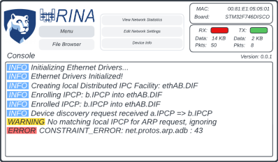 Once again, students from Penn State Behrend, Anthony Immekus, Keian Kaserman, Robert Myers, and Mason Ticehurst took on the challenge of implementing an experimental RINA setup. They started with a Linux implementation of RINA, rlite, and then extended it to communicate with a bare-metal STM32F746 Discovery board. The students developed an Ada binding to rlite, ported RINA's core model to Ada, adapted Stephane Carrez’s ada-enet for his STM32 Ethernet support, built a bare-metal touch-based GUI with a file manager, and managed to establish communication over Ethernet with the Linux machine using core RINA principles.