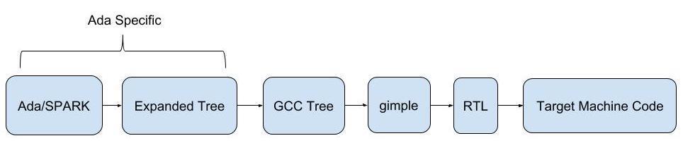 Note that this is not fundamentally different from what’s already happening in a compiler today. Compilation is essentially a series of translations from one language to the other, each one being used for specific optimization or analysis phase. In the case of GNAT for example the process is as follows: