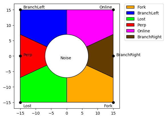 For an example, let’s assume our window is 5 states wide and we have detected the following list of states (BranchLeft, BranchLeft, Online, BranchLeft, Lost). If we map these to coordinates we get the following window: ((-15, 15), (-15, 15), (15, 15), (-15, 15), (-15, -15)). When we average these coordinates in the window we get a point with the coordinates (-9, 9). If we look at our lookup table we can see that this coordinate is in the BranchLeft polygon.